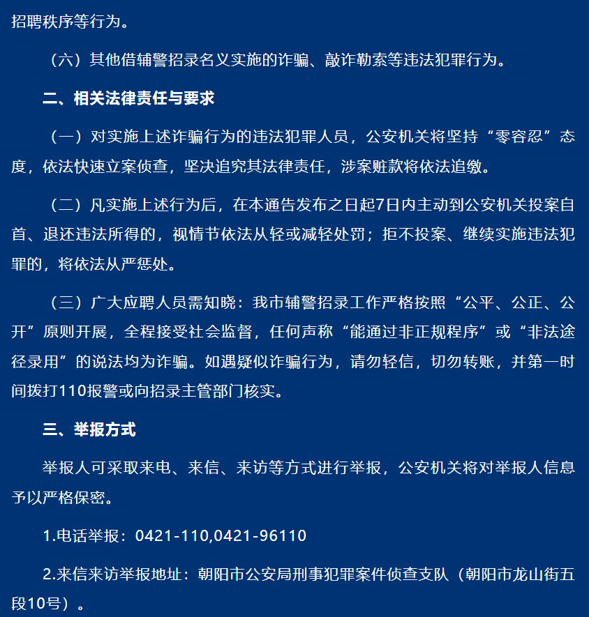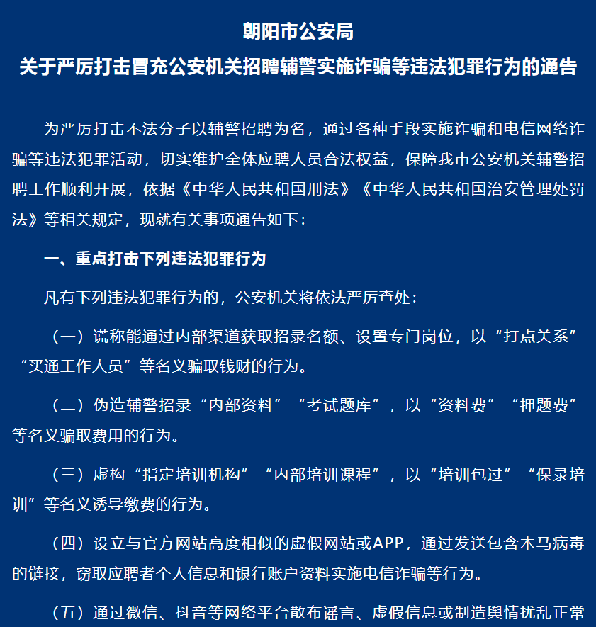 朝阳市公安局关于严厉打击冒充公安机关招聘辅警实施诈骗等违法犯罪行为的通告